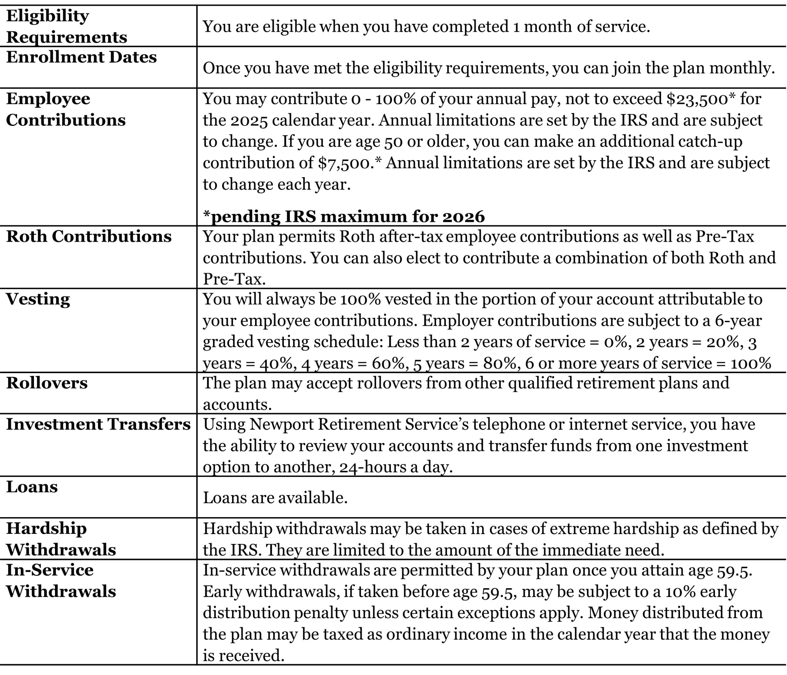 The Lane Press, Inc. offers a 401(k) plan to employees through Ascensus. Ascensus offers a wide selection of investment options to help you plan better for retirement. Basic plan details are listed below and outlined in more detail in the Summary Plan Description. If you have questions about the plan, you can send an email to HelpRetire@therichardsgrp.com to receive assistance from TRG Retirement Plan Consultants. You can also call Ascensus directly at (844) 749-9981 or access your account online at secure.ascensus.com.